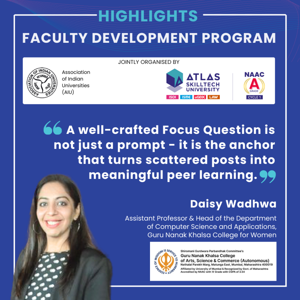Ms. Daisy Wadhwa, Assistant Professor & Head of Computer Science & Applications, GNKCW (Ludhiana), showcased how the LxI cycle— Focus Question → Peer Interaction → Reflection Quiz creates structured, motivating and meaningful learner engagement. She highlighted how high-quality focus questions and guided responses transform discussion forums from passive spaces into active learning hubs.